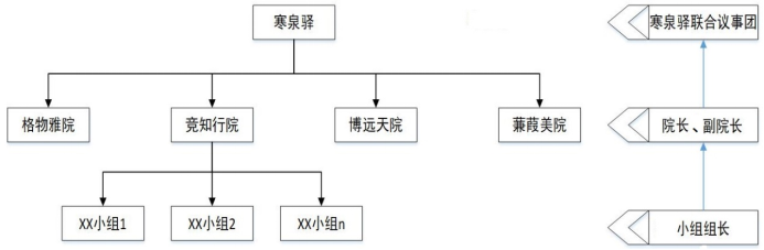 “寒泉驿”由四大书院组成,每个书院设置院长1名和若干名副院长,由书院全体成员推选产生;每个书院由若干兴趣小组组成,兴趣小组由学生自主发起成立,发起人为兴趣小组组长。每个书院的院长和副院长组成所属书院的书院联合议事团;四大书院的所有院长和副院长组成寒泉驿联合议事团。