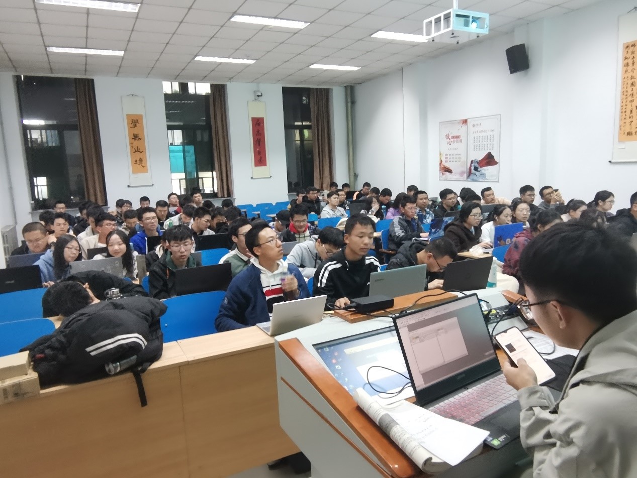 培训中,李钒钒同学首先对知识进行了主要讲解,讲解完后,与刘嘉栩和李欢同学一同对有问题疑惑的学生进行耐心地解答和帮助;随后,大部分同学在实验室成员的指导下认真完成了新建工程和LED流水灯的操作,在有限的时间内取得了有效的成果。