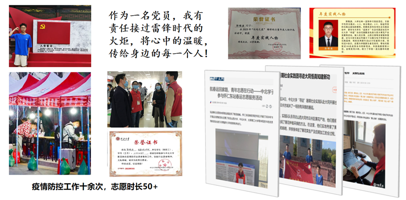 作为一名党员,我有责任接过雷锋精神的时代火炬,将心中的温暖,传递给身边的每个人。助农、支教等场景都出现过我的身影。特别是新冠疫情期间,我成为逆行者,参与志愿服务工作十余次,时长累计50多小时。