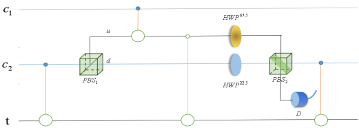 一次偶然的机会,我有机会跟随老师从事基于线性光学元件的量子信息处理研究,这也是我第一次接触科研,阅读博士论文、英文文献,这都是我之前做不到的事情,经过一个月的熬夜专研,我设计出了一种三量子比特的Toffoli门的最佳合成方案。借助高维希尔伯特空间,将三量子位Toffoli门的成本从8个CNOT降低到5个最近邻的CNOT。还推广到了具有2n + 1个CNOT和2(n-1)个单量子运算的n-控制量子比特Toffoli门的构造。然后,我们分别在光子架构中设计确定性和非确定性三比特Toffoli门。非确定性门的成本进一步降低到4个最近的CNOT,单光子探测器预示了这种门的成功。
