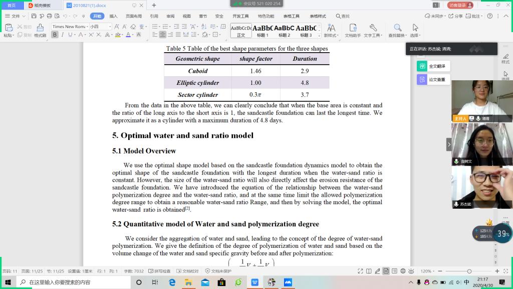 在这四天过程中,遇到过很多的难题和分歧,我们坚持自己观点的同时,听取彼此的意见,模型的复杂性可能让我们抓不住重点,对此,我们付出了特别多的时间去讨论如何建立模型,验证模型的合理性,思考模型是否可以让别人读懂,以及我们是否可以融入更多的元素去考虑。在这个过程真的有过特别艰难、寸步难行的时候,但是我们从过来没想过放弃,每当陷入困境,就静下心来去思考,去讨论,总是能迎来柳暗花明的时候。