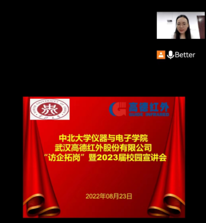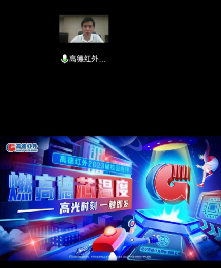 与武汉高德红外股份有限公司通过线上会议的方式举行“访企拓岗”的交流会,同时还进行了2023届的就业宣讲。学院党委书记郝晓剑、院长刘文怡、副院长李杰与武汉高德红外有限公司的人力资源、技术研发部门的领导进行了交流。参加交流宣讲会的还有2023届的研究生代表。会议由学院党委副书记杜瑞平和公司的人力负责人冷晓凯联合主持。