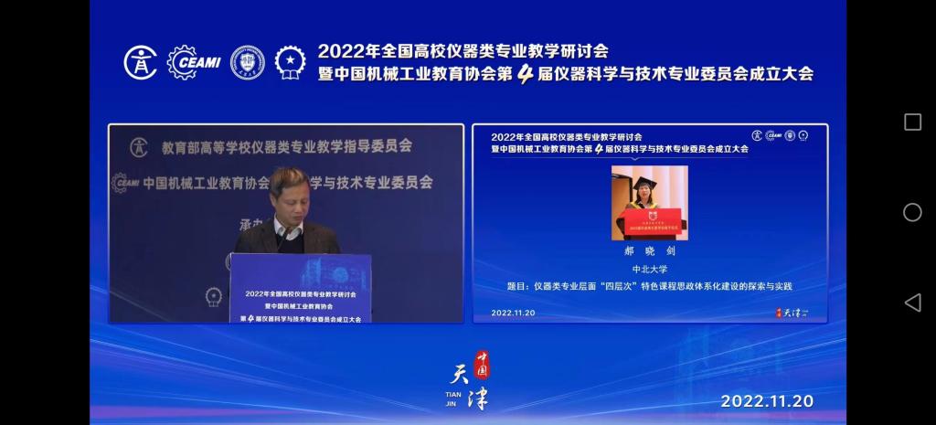 2022年全国高校仪器类专业教学研讨会暨中国机械工业教育协会第4届仪器科学与技术专业委员会成立大会于2022年11月21日在天津市、北京市成功在线上与线下同步召开。本次会议邀请国内、外相关领域知名学者、教学专家参会,就仪器类专业的课程思政及一流课程建设展开深入交流与讨论。学院党委书记郝晓剑、院长刘文怡、王红亮副院长、谭秋林副院长、张志杰教授、刘文耀教授、郭乐祥老师在线上参加了会议。