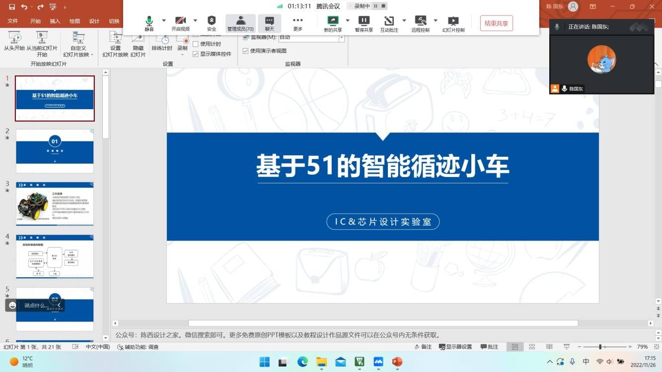 2022年11月26日下午17:00,IC设计与智能控制实验室开展第九次线上科普培训,培训的内容为基于51单片机的智能循迹小车相关内容。