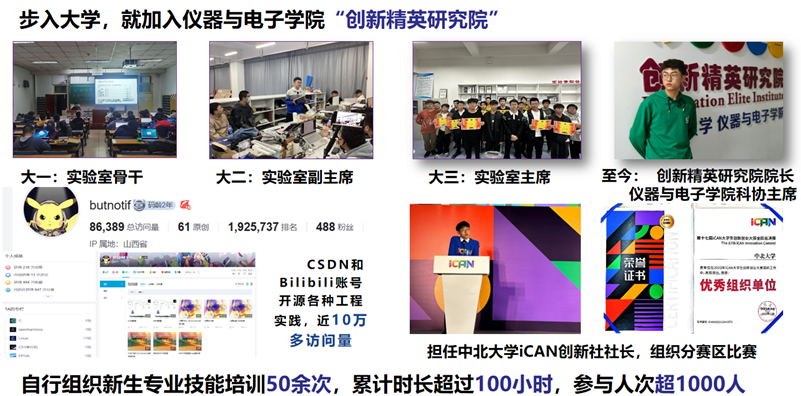 我想成为像张桂梅校长那样无私奉献的人,我从大一加入创新精英研究院,从实验室骨干,到实验室主席,再到现在的研究院院长,在提升自己的同时积极反哺“传帮带”;这三年里,我多次担任主讲人,为同学们进行普及培训,分享我的竞赛和学习经验,并将学习心得,分享于CSDN、bilibili等社交平台,帮助学弟学妹们解决困惑,现已有近10万访问量。