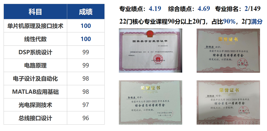 本科生最高荣誉)、国家奖学金、国家励志奖学金、综合素质特等奖学金(两次)、“仪电之星,榜样的力量”年度实践人物等;作为第一发明人申请实用新型专利1项,软件著作2项,科技竞赛硕果累累,曾获第十八届“挑战杯”大学生课外学术科技作品竞赛国家级特等奖等国家级奖项21项,省级奖项36项;曾参加疫情防控志愿者,大学生“返家乡”志愿者等社会实践,并被人民日报,中国日报,中国网等多家主流媒体报道。现已保研至中国科学院微电子研究所院士团队。