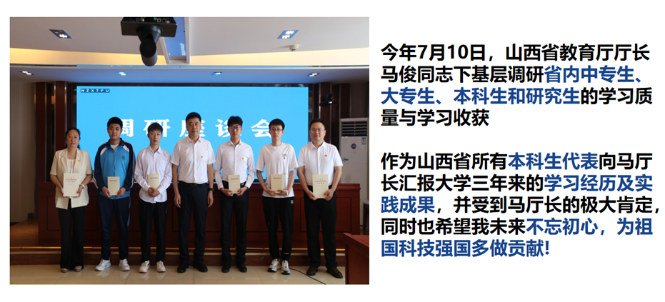 今年7月,我作为山西省本科生代表,向山西省教育厅厅长马骏同志汇报了大学三年的成长经历和实践成果,他为此提出肯定和赞许,并殷切期望我能继续努力,为祖国科技强国添砖加瓦!