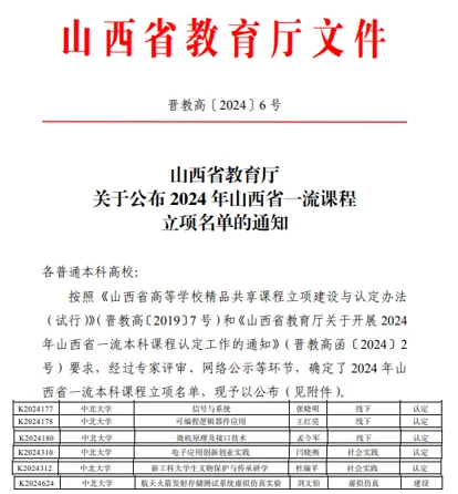 2024年7月,山西省教育厅公布2024年山西省一流课程立项名单,学院张晓明老师课程团队负责的《信号与系统》课程、王红亮老师课程团队负责的《可编程逻辑器件应用》课程、孟令军老师课程团队负责的《微机原理及接口技术》课程、闫晓燕老师课程团队负责的《电子应用创新创业实践》课程、杜瑞平老师课程团队负责的《新工科大学生文物保护与传承研学》课程等五门课程入选山西省一流课程立项认定课程,刘文怡老师课程团队负责的《航天火箭发射存储测试系统虚拟仿真实验》课程入选山西省一流课程立项建设课程。