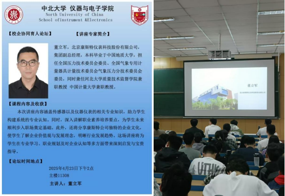 11308教室进行了校企联合授课,邀请来自北京康斯特仪表科技股份有限公司集团副总经理董立军作为主讲嘉宾,为同学们带来了一场以“传感器测试标校”为主题的精彩课程。