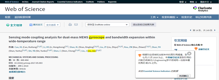 刘俊教授领衔的抗高过载微机械陀螺仪方向的研究论文《Sensing mode coupling analysis for dual-mass MEMS gyroscope and bandwidth expansion within wide-temperature range》入选工程学领域ESI高被引论文。该论文以青年教师曹慧亮副教授为第一作者(刘俊教授为通信作者)发表于《MECHANICAL SYSTEMS AND SIGNAL PROCESSING》期刊(工程:机械领域一区,TOP期刊,2017年影响因子4.37)上,重点解决了微机械陀螺仪机械灵敏度和带宽之间相互矛盾的问题,为高精度、宽带宽微机械陀螺仪的进一步工程应用提供了支持。