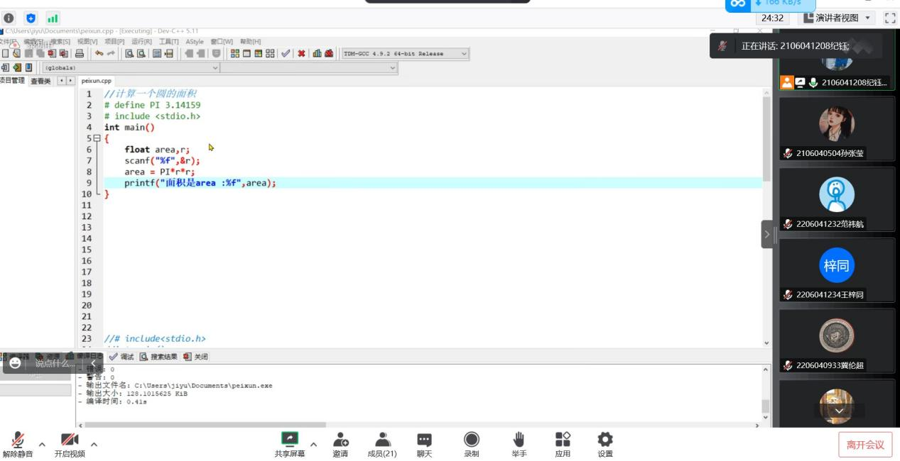 本次为第四组第二次科普培训,主讲人为21级纪钰,部分实验室骨干和22级实验室新成员参加了本次科普培训。本次科普培训为线上进行,纪钰学姐为大家讲述了C语言中数据,顺序结构,选择结构这三个主要的模块,包括但不限于if语句,Switch语句等一些重要的语句结构,并为大家进行了上机演示,大家也积极提出自己遇到的问题,并且在学长学姐的帮助下解决了问题,学习氛围十分良好。