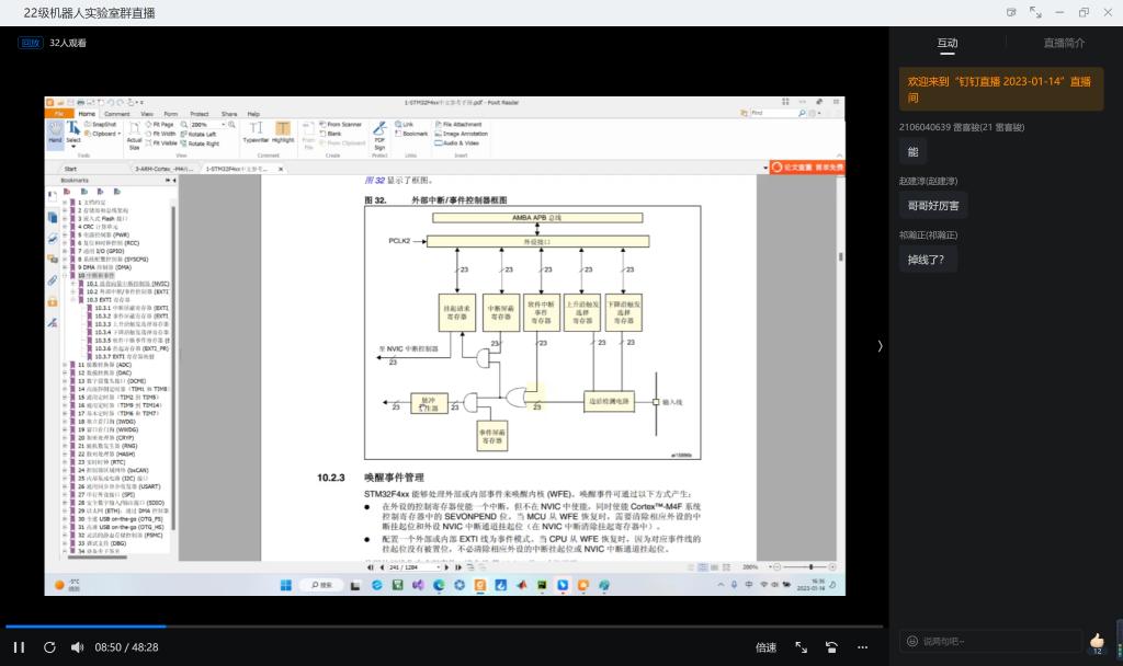 本次培训的主讲人为胡董宇,主要内容为对stm32中断的讲解。首先,胡董宇通过拓扑图的形式,并通过tm32技术文档,对中断的概念,中断的结构和中断优先级进行讲解,使得同学们能够初步了解中断。之后,胡董宇为大家讲解中断如何配置与注意事项,并着重讲解中断优先级的配置。最后,胡董宇通过示例程序为大家演示如何配置,使得同学们能够对中断有更深的了解。