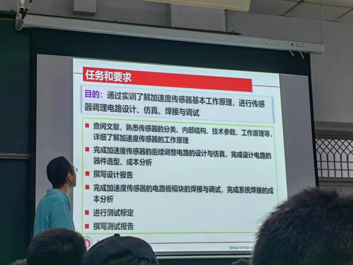 在4月15日加速度传感器模块的理论课上,赵锐老师、刘丽双老师与温焕飞老师为同学们系统分析了加速度传感器模块的任务要求以及设计报告的撰写要求,同时布置了设计部分的相关任务,将整个设计部分分为两个任务:“需求分析”和“建模仿真”,最后各小组以PPT答辩和提交设计报告的形式进行设计部分的成果验收。同时针对同学们在方案设计过程中遇到的各种问题,老师们耐心地引导学生找到适宜的解决方案,加强同学们将理论和实践相结合的能力。