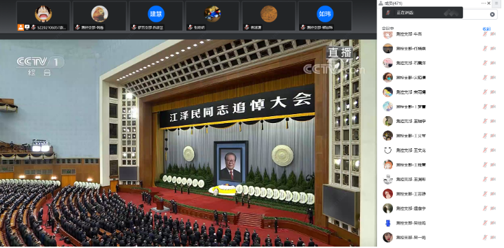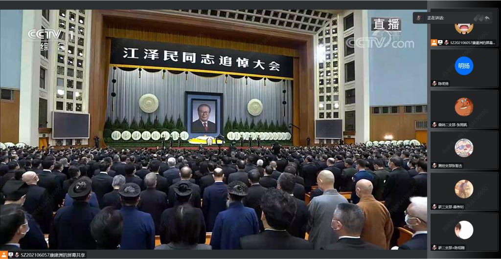全体师生党员线上集中观看直播、沉痛哀悼江泽民同志,追悼大会默哀时全体就地就近默哀3分钟。