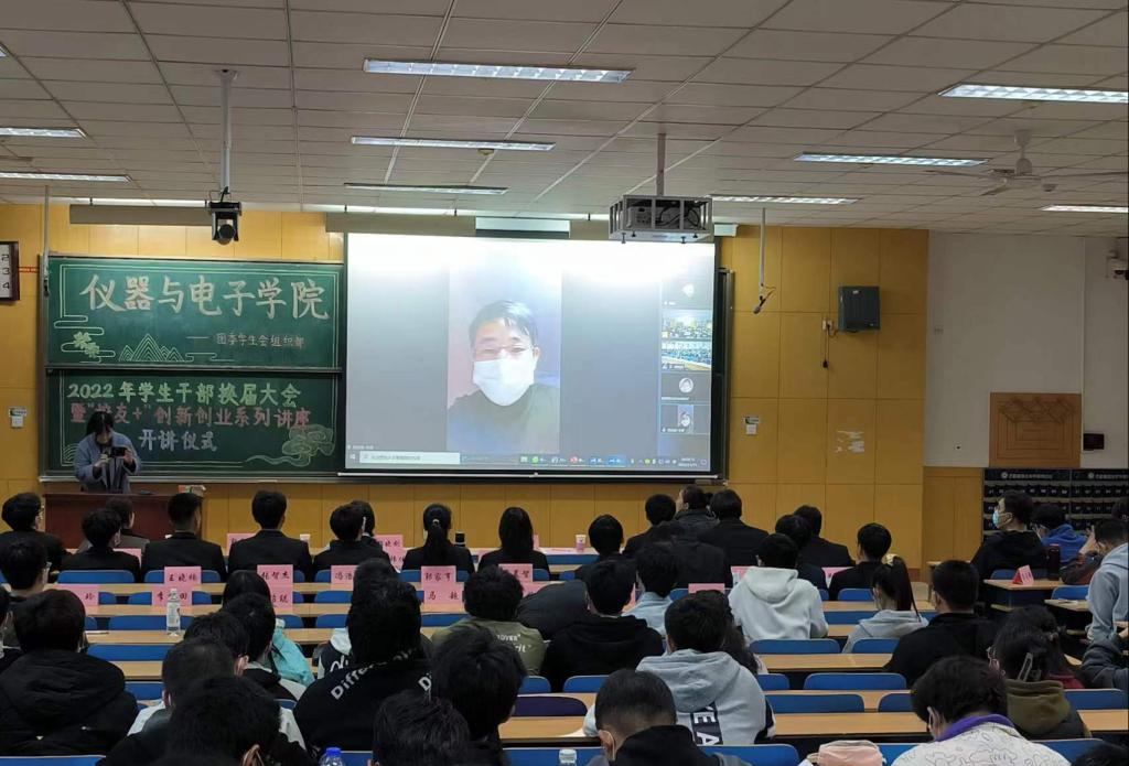 在11408H举行了2022年学生会干部换届大会暨“校友+”创新创业系列讲座第一讲。院党委书记郝晓剑、副书记杜瑞平,学院辅导员郭乐祥、李晨鑫、王蕾、姚瑶及全体学生干部参加本次活动。