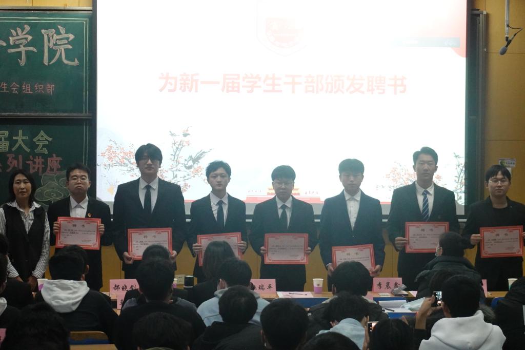 随后,辅导员姚瑶宣读了新一任学生干部名单,郝晓剑书记为新一届任学生干部颁发聘书,辅导员郭乐祥、李晨鑫、王蕾为新一任学生干部佩戴胸牌。