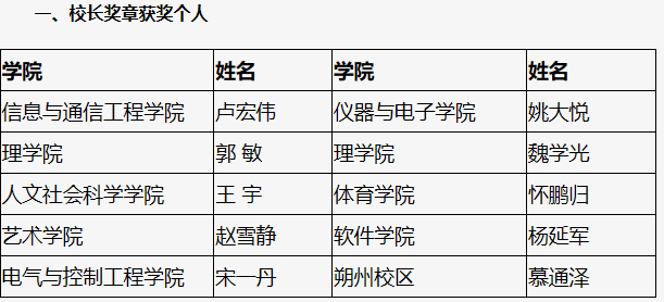 第九届“中北奖章”及“中北奖章提名奖”获奖集体,“校长奖章”及“校长奖章提名奖”获奖个人,现将评选结果公示如下: