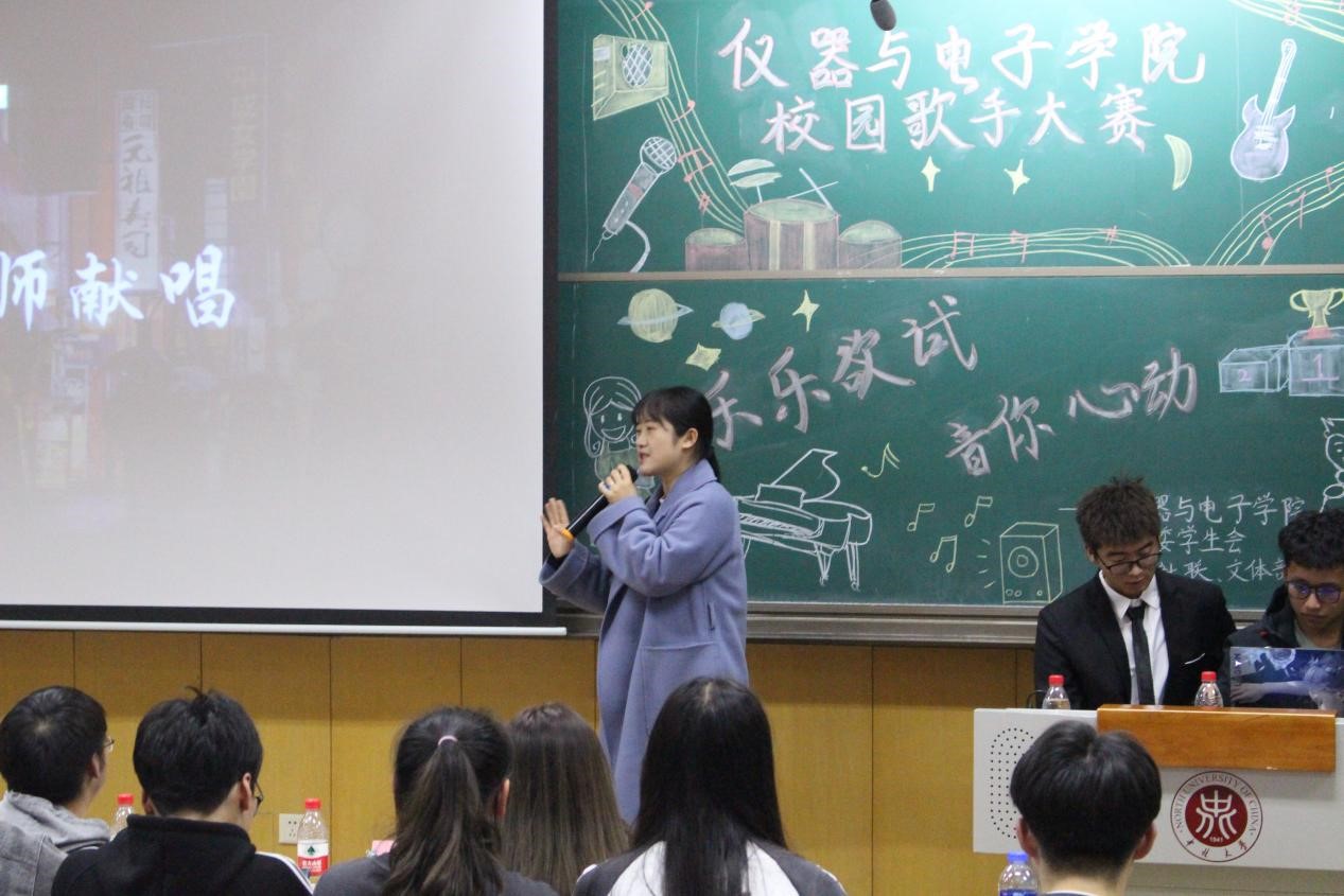 团委姚瑶老师为我们带来了歌曲《稻香》,在台下观众闪光灯的点缀下,在姚瑶老师动听的演唱下,大家紧张的心情得到舒缓。在最后激烈的竞争下,决赛名单终于知晓。紧接着最后一轮决赛开始,冠军的争夺战开始,金颉凭借一首《天后》打动了台下的观众,取得了冠军,姚嘉详和苗云鸿取得亚季军。最后,在激烈的掌声下,在欢快的氛围中,颁奖环节顺利进行并标志着本次歌手大赛的圆满结束。