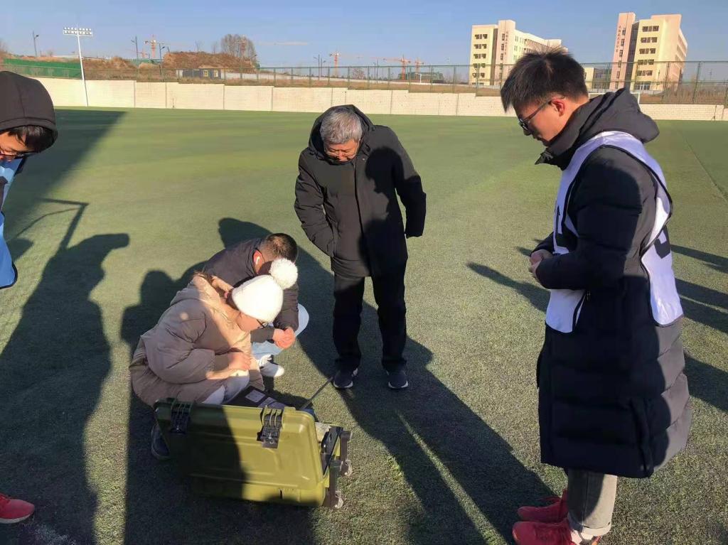 接着张老师带领研究生和同学们前往东区足球场开展了定位实验,同学们身着号码服,手上佩戴好定位手环,将定位基站安置在固定位置,在足球场上活动,模拟比赛中的实际情况,通过终端设备记录活动轨迹。