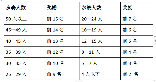 3、在不超过获奖人数的前提下,若成绩相同,可设并列,按成绩从高到低根据奖励规定确定名次。因并列原因,出现拟奖励数超过规定数,需进行附加赛,按成绩从低到高根据规定奖励名次确定参加附加赛的人数,同期比赛,以附加赛成绩决定最后名次。附加赛开始,现场三次点名不到者,视为弃权。