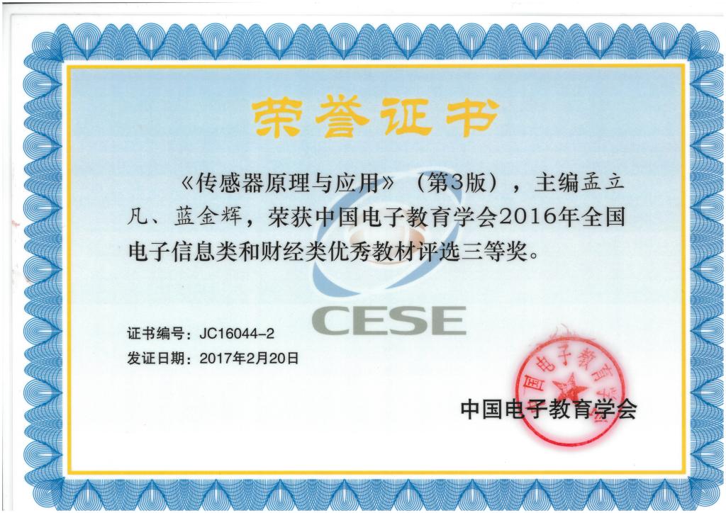 《传感器原理与应用第(第3版)》,主编孟立凡等,获中国电子教育学会2016年全国电子信息类和财经类优秀教材评选三等奖。 |
